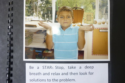 Post the S.T.A.R., Drain, Balloon and Pretzel icons around the room and in key locations like the Safe Place. Use props like a star wand or the Safe Place Mat to encourage deep breathing. Play music like the “S.T.A.R. Song” on It Starts in the Heart and “Calm Your Brain” on Brain Boogie Boosters to provide helpful musical reminders for active calming. Model S.T.A.R. and other breathing techniques yourself during stressful moments. Create a class job for the “S.T.A.R. helper,” who is responsible for assisting others in breathing deeply.