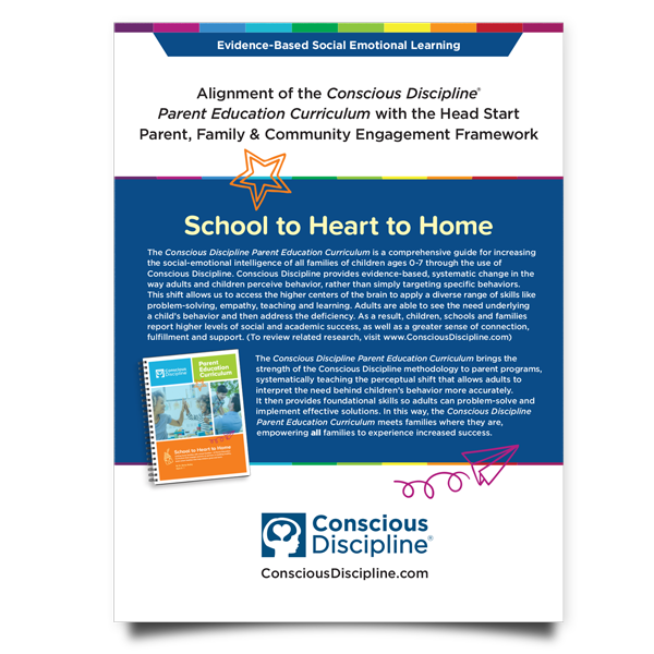 Conscious Discipline teaches children social-emotional skills by increasing the social-emotional aptitude of the adults who care for them. As such, parent education is an integral component of any Conscious Discipline program. This download aligns the Conscious Discipline Parent Curriculum with the Parent, Family and Community Engagement Framework from Head Start.