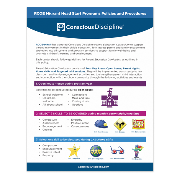 The Conscious Discipline Parent Education Curriculum is designed for centers serving children from birth through five years old. It features sixteen hours of training content and addresses three key points of contact with families: Parent Nights, Home Visits, and targeted Mini Sessions.
